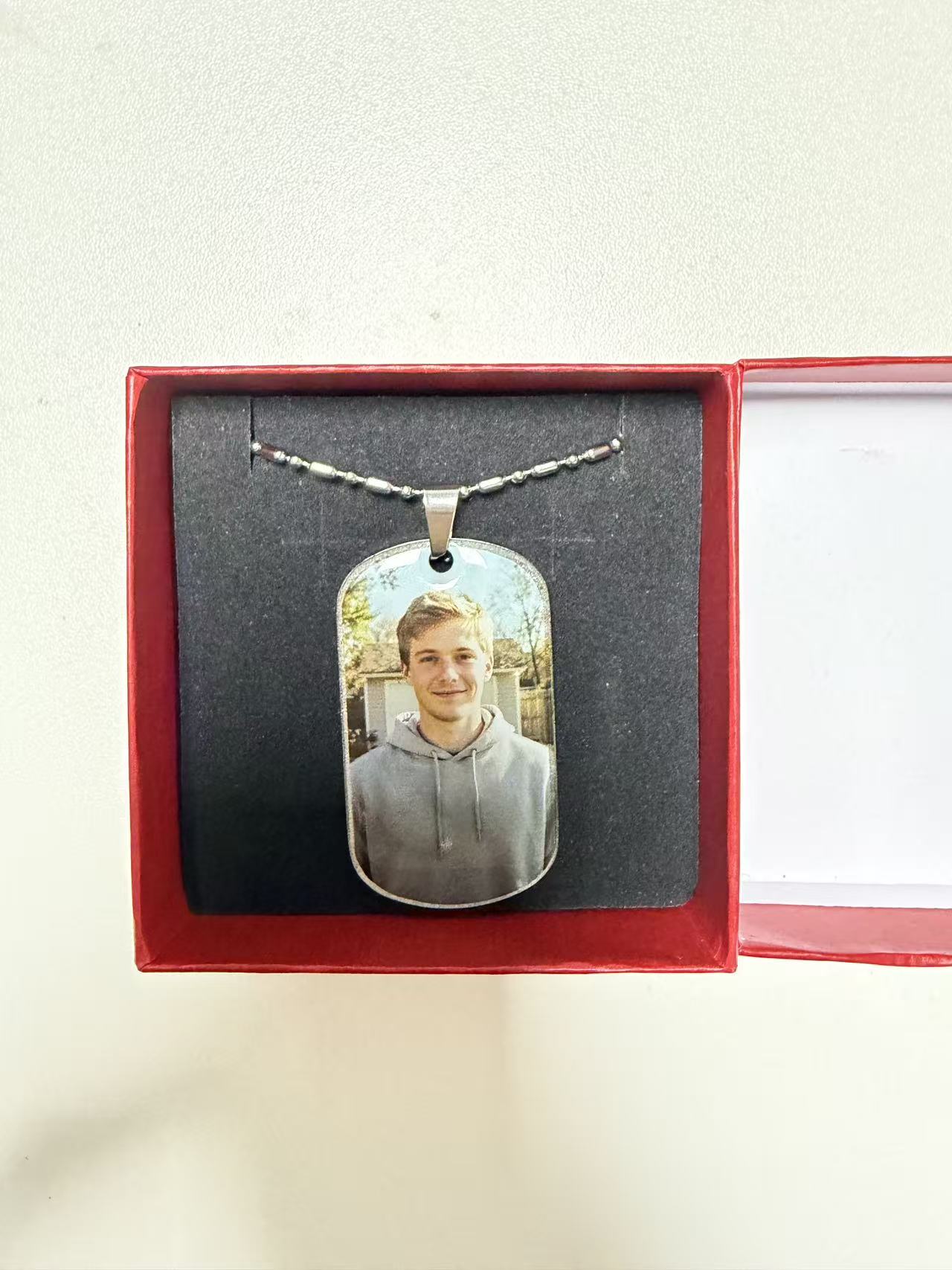I ordered this dog-tag style pendant for my boyfriend for our anniversary, and he absolutely loves it! The photo quality is surprisingly clear, and it feels very sturdy. It came in a cute little red box, ready to gift. It’s such a meaningful way to keep a memory close. Highly recommend if you want something personal and high-quality!”