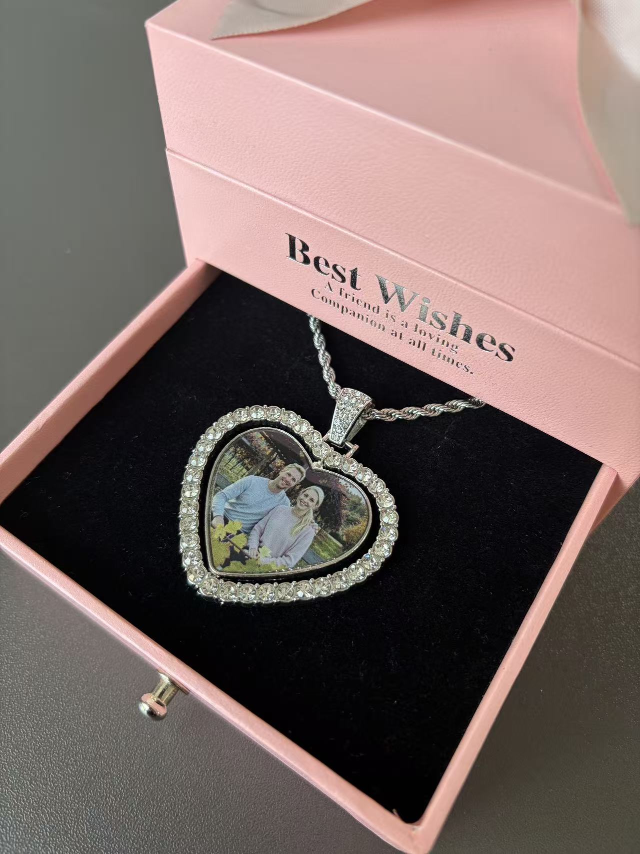 The crystals around the heart pendant are so sparkly in person! I was worried the photo might look tiny, but the cropping is perfect (Step 2 of their process really works!). The pink ‘Best Wishes’ box makes it look very high-end. I’ve been wearing it every day and getting so many compliments. Thank you for such a beautiful keepsake!”