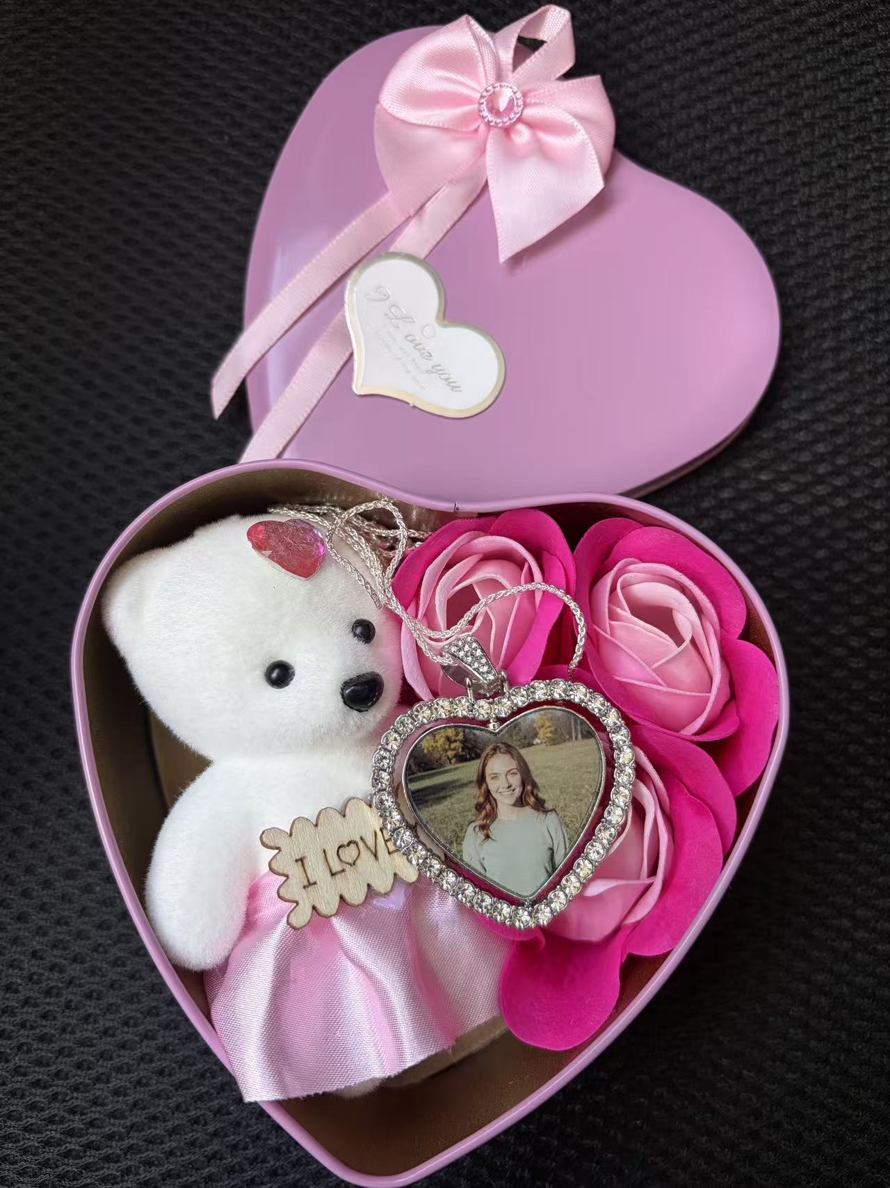 I was looking for a special birthday surprise for my girlfriend, and this heart pendant set was perfect. The little bear and the roses in the heart-shaped box made the presentation so romantic. She was moved to tears when she saw our photo inside the pendant. The craftsmanship is beautiful. It’s more than just jewelry; it’s a memory.